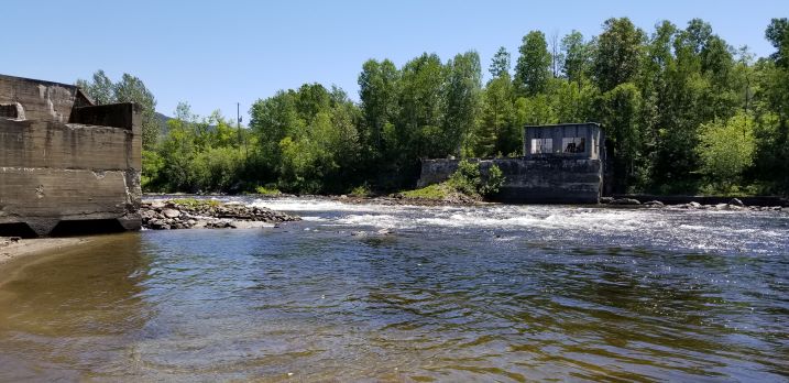 The gravel bars, islands and rapids below Colebrook were fun, but then it flattens out and it gets shallow again until you reach Columbia Bridge. A popular location for float fisherman to start a trip. I spoke with a number of them casting for trout in the stretches down to Lemington access. All were using flies or silver Rapalas and I only brought spinners. I passed Stacey’s home in this section and she had pitchers of well water and my missing reading glasses waiting for me at their river access. Thank you Stacey! The final section to Lyman Falls was some of the best rapids I had run so far on the river. I could find enough water for my boat to pass without scrapping, and the scenery was very pretty. In the old back water from the Lyman Dam, I watched both a loon and an eagle take trout right in front of me. I could get fish to follow my lure, but still couldn’t catch any! The final rapid to Lyman Falls had the most water on river right, but the biggest opening around the dam was on river left. An aggressive back ferry got me over, and as stated by many sources, I ran the drop right on the NH shoreline. At my water level, it was a gravel bar, but I slid over without a problem. I camped right on the gravel beach (NH side) against the willows, and I caught a number of brown trout at this location. I did have company – a family who drove in from the highway to spend the night, but there was plenty of room at the site for correct social distancing.